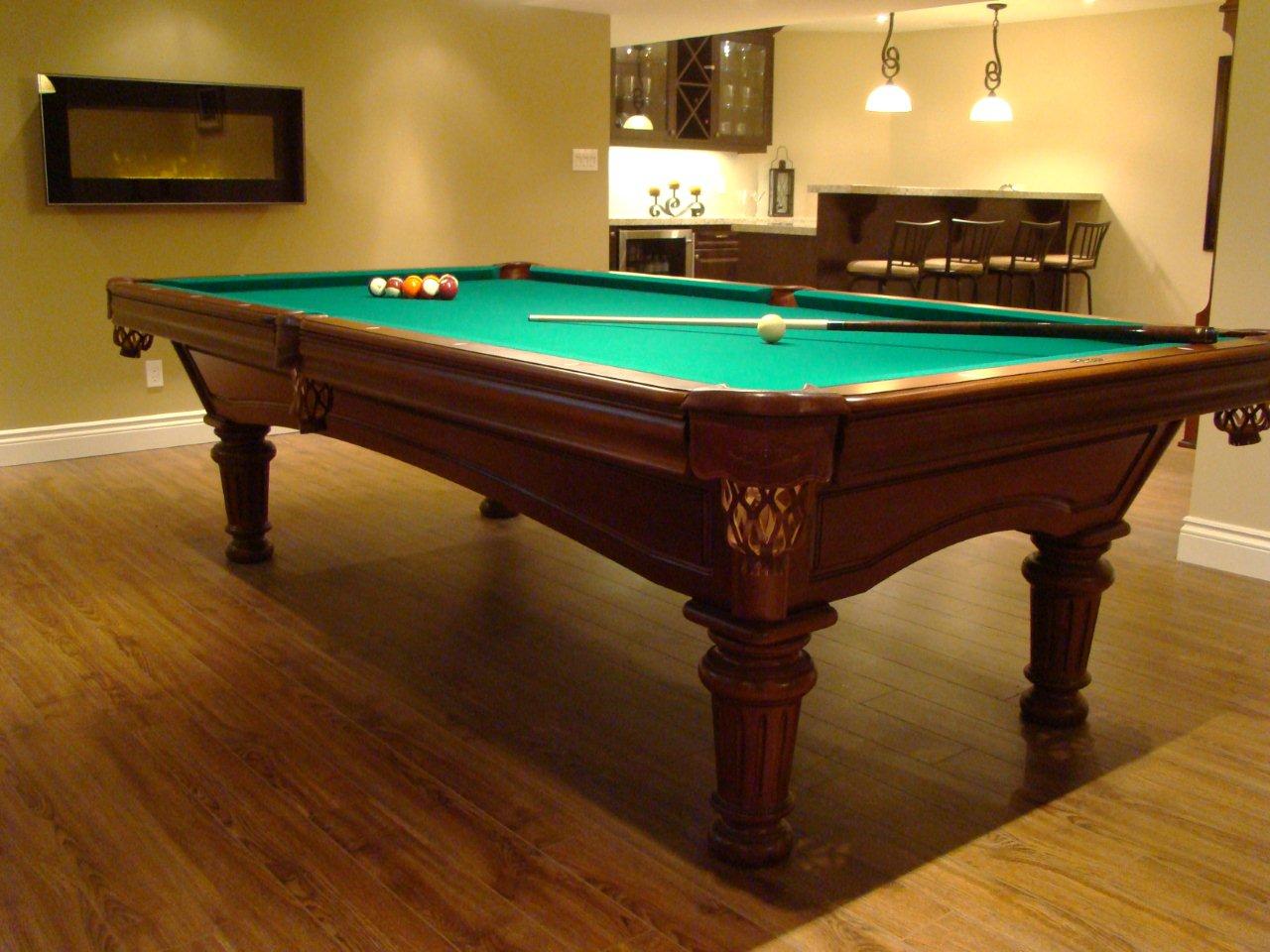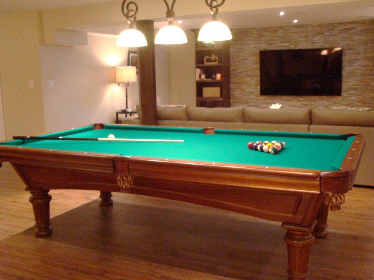 Beautiful Brunswick Pool Table in front of wall mounted Electric Fireplace
